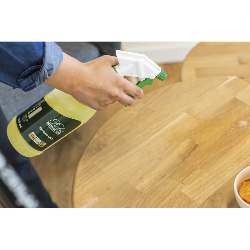 Spray een kleine hoeveelheid Surface Care gelijkmatig op het oppervlak. Wrijf het product in met een microvezeldoek of een wisser voor vloeren. Laat het kort intrekken en veeg het oppervlak daarna droog met een schone, droge doek. Voor een optimaal resultaat regelmatig gebruiken.